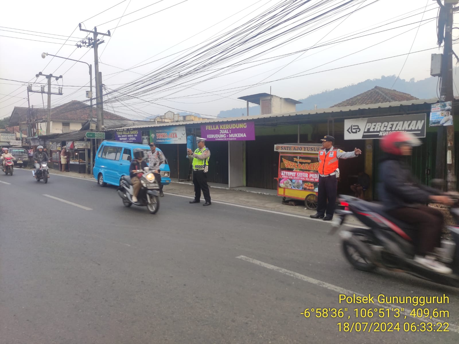 Kegiatan penjagaan dan pengaturan lalu lintas yang dilaksanakan personel Polsek Gunungguruh ini merupakan kegiatan rutin setiap pagi,siang dan sore hari saat jam berangkat dan pulang aktivitas masyarakat.