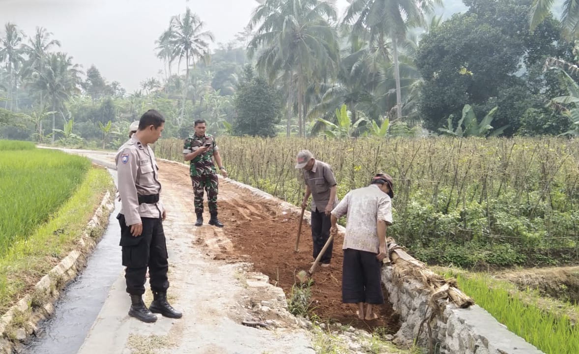Bhabinkamtibmas Selawangi Aipda Yusup bersama Babinsa Selawangi Sertu Yudi monitoring pembangunan perbaikan Jalan, Pelebaran Jalan Kp.Cipurut Rt.01/02 Desa Selawangi Kecamatan Sukaraja Kabupaten Sukabumi, Senin (29/07/2024)