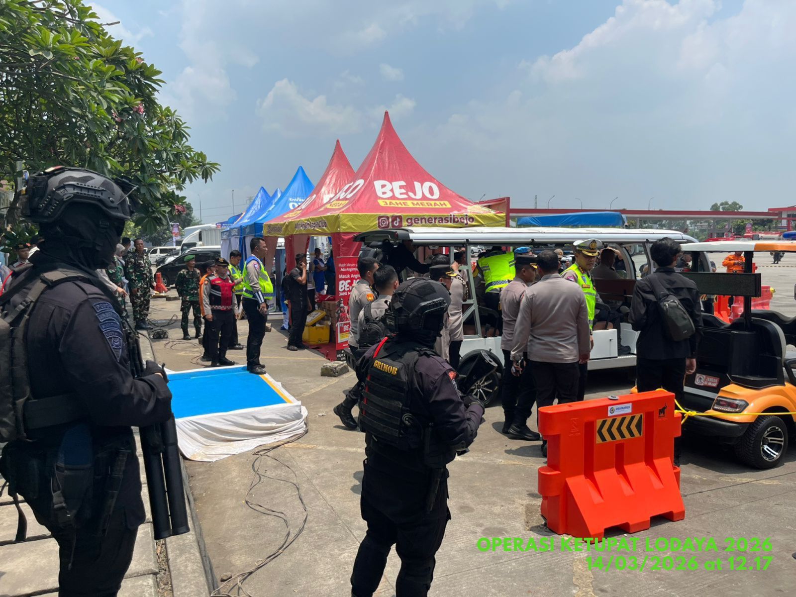 Selain pengamanan di wilayah kota, personel Brimob juga melaksanakan kegiatan pengamanan di Rest Area KM 57 Tol Jakarta–Cikampek, salah satu titik strategis arus mudik.