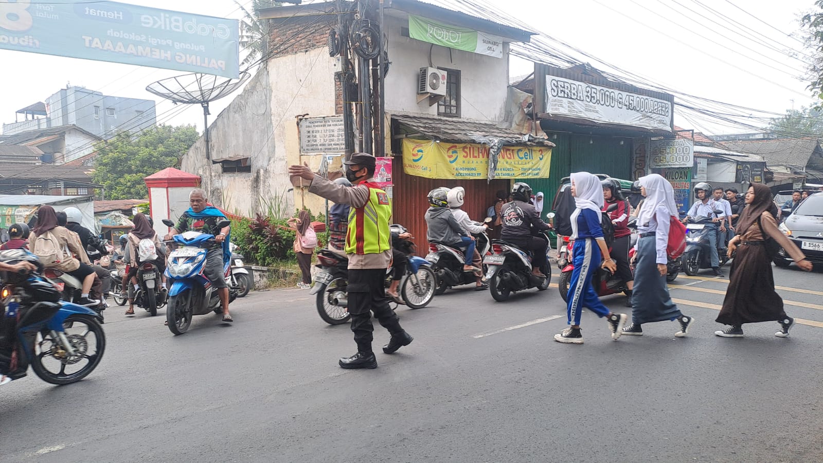 Seperti yang terlihat di depan Pos gatur MAN 1 Kota Sukabumi – Pos gatur SMAN 1 Kota Sukabumi – Pos gatur SMPN 3 Kota Sukabumi – Pos gatur SDN CBM Kota Sukabumi – Pos gatur SMKN 2 Kota Sukabumi – Pos gatur perempatan Cigodeg Kota Sukabumi dan Pos Singgah SPBU Pertamian Kota Sukabumi. nampak Petugas Polsek Citamiang sedang melakukan pengaturan arus lalu lintas dan menyeberangkan anak-anak yang masuk sekolah.