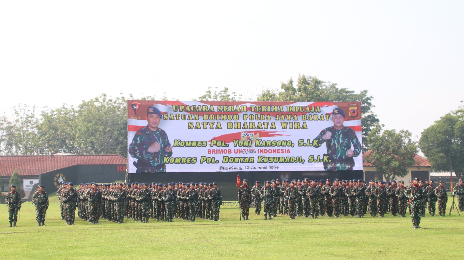 Upacara sertijab ditandai dengan penyerahan tongkat komando dan penyerahan Dhuaja Satbrimob Polda Jabar “Satya Bharata Wira”.