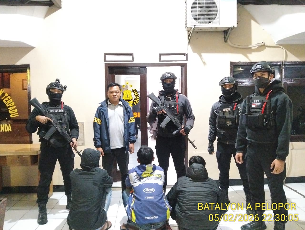 Pada pukul 20.25 WIB, regu patroli tiba di Jalan Raya Jatinangor, tepatnya di sekitar kawasan Universitas Padjadjaran. Di lokasi tersebut, petugas mendapati sekelompok pemuda yang sedang berkumpul menggunakan sepeda motor dengan knalpot tidak standar sehingga menimbulkan kebisingan dan keresahan masyarakat sekitar. Saat dilakukan pendekatan, dua orang pemuda sempat mencoba melarikan diri, namun dengan kesigapan personel Brimob, keduanya berhasil diamankan untuk dilakukan pemeriksaan di lokasi awal.