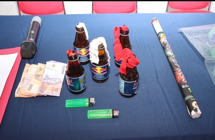 Lanjut Kapolres menjelaskan, Bom molotov ini rencananya digunakan untuk menyerang institusi, adapun benang layangan dipakai untuk menjerat petugas, sementara cat pilox untuk aksi vandalisme.