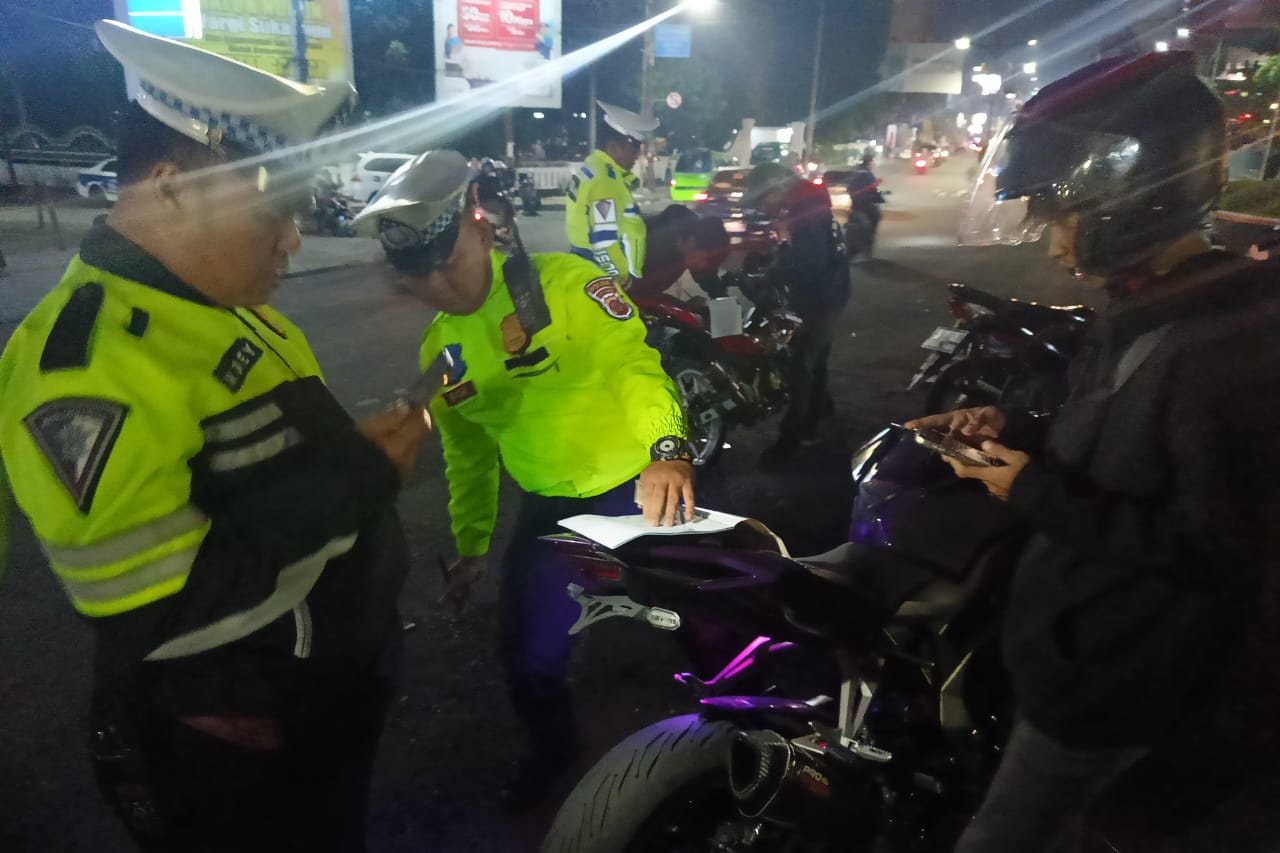 Kota Sukabumi – Belasan pengendara sepeda motor yang memodifikasi kendaraannya dengan Kanlpot tidak sesuai spesifikasi terjaring KRYD (kegiatan rutin yang ditingkatkan) Polres Sukabumi Kota di Jalan A Yani Cikole Kota Sukabumi, Sabtu (22/6/2024) malam.