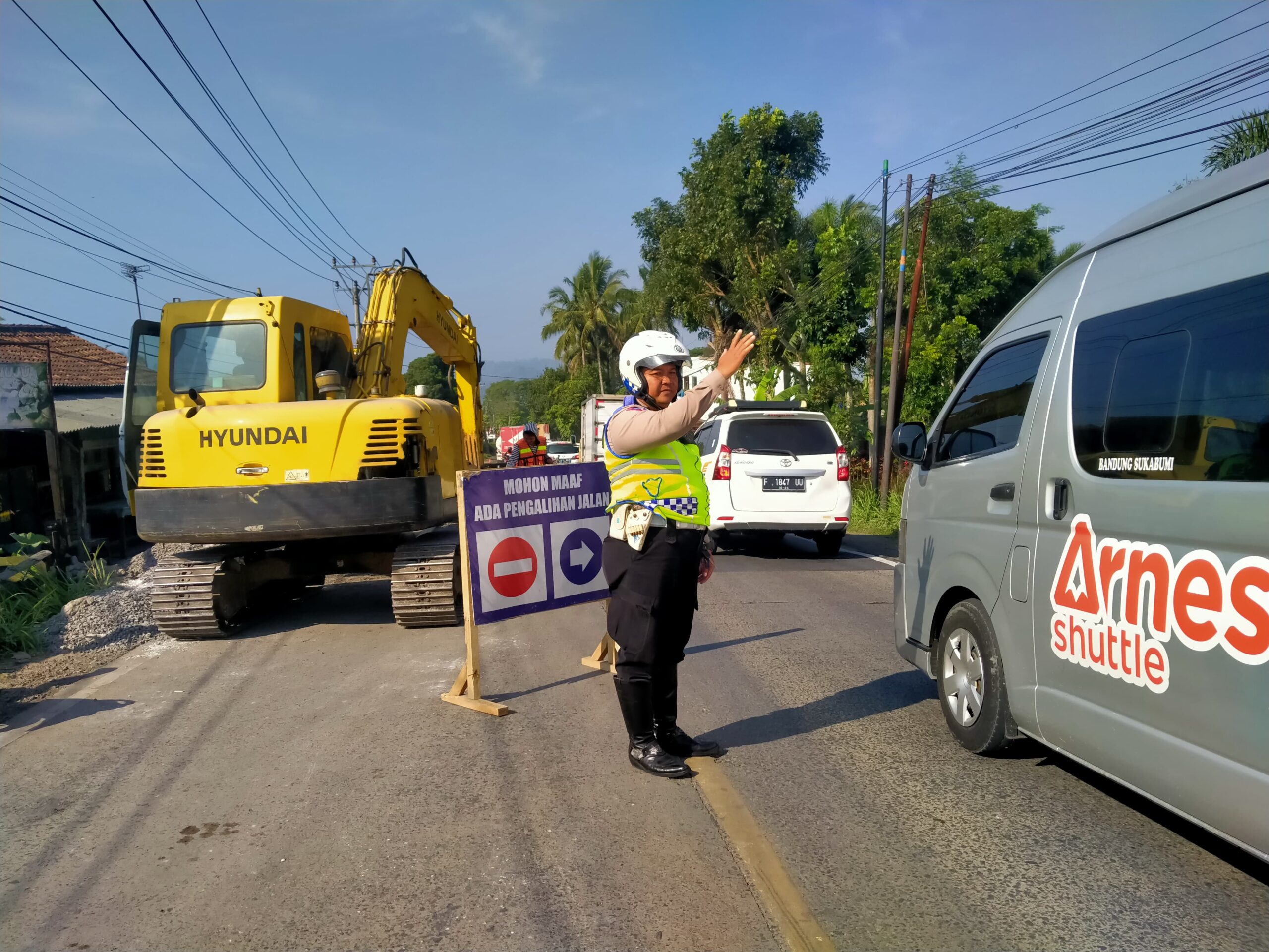 Untuk mengatur arus lalu lintas polisi disiagakan di lokasi proyek pengecoran jalan untuk mengurai kepadatan kendaraan serta mencegah praktik pungutan liar yang dilakukan oleh juru parkir liar.