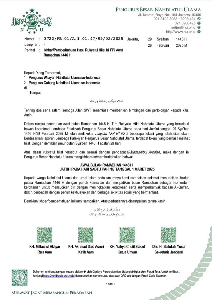 Jakarta, Faktaperistiwanews.co.id – Kementerian Agama Republik Indonesia melalui sidang isbat yang digelar hari ini secara resmi menetapkan bahwa 1 Ramadan 1446 Hijriah akan jatuh pada Sabtu, 1 Maret 2025. Keputusan ini diambil setelah dilakukan pemantauan hilal di berbagai wilayah di seluruh tanah air, mulai dari Indonesia bagian timur, tengah, hingga barat.