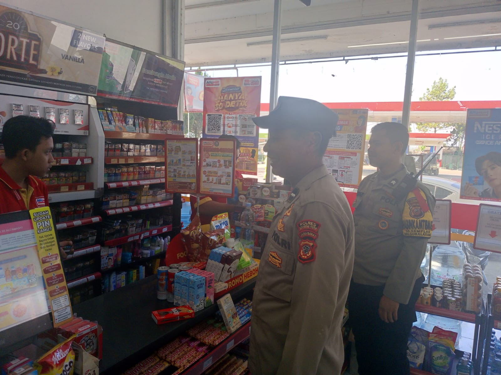 Kota Sukabumi – Polsek Sukalarang Polres Sukabumi Kota, Polisi Sampaikan Himbauan Kamtibmas Kepada Karyawan Minimarket saat Patroli Siang Senin (07/10/2024).