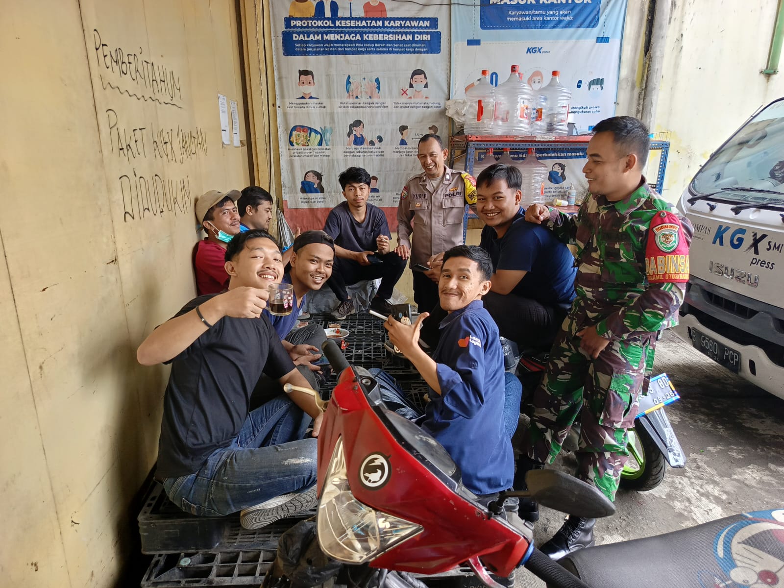 Dalam kegiatan ini Aiptu Yudi. P bersinegritas Babinsa Koramil Baros mengajak Karyawan kantor jasa pengiriman KGX agar senantiasa menjaga dan meningkatkan kewaspadaan, keamanan, kenyamanan lingkungan kerja