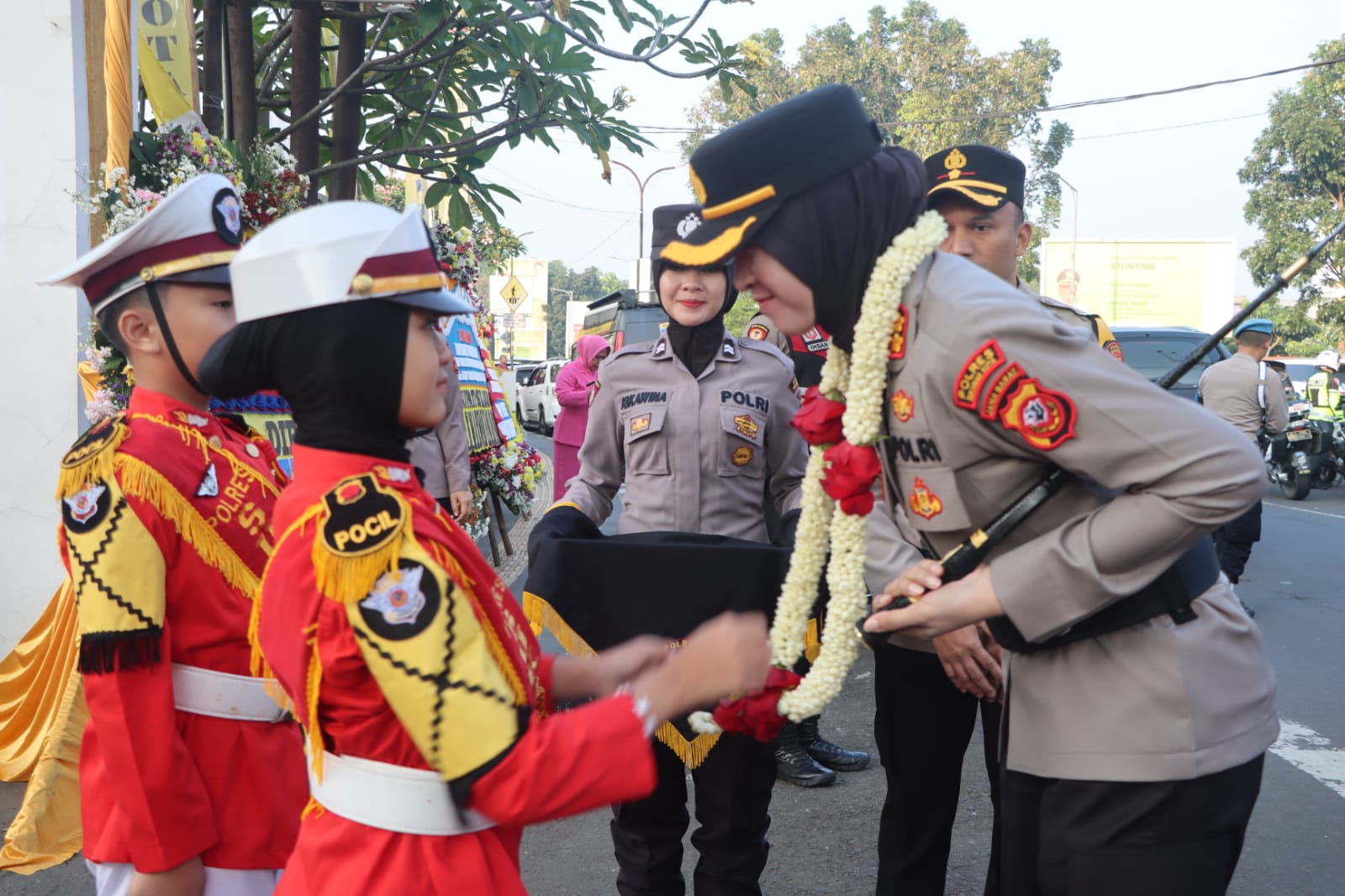 Kota Sukabumi – Dua Pocil (Polisi Cilik) asuhan Polres Sukabumi Kota menyambut kedatangan AKBP Rita Suwadi selaku Kapolres Sukabumi Kota yang baru dengan kalungan bunga di Mapolres Sukabumi Kota, Jum’at (19/7/2024).